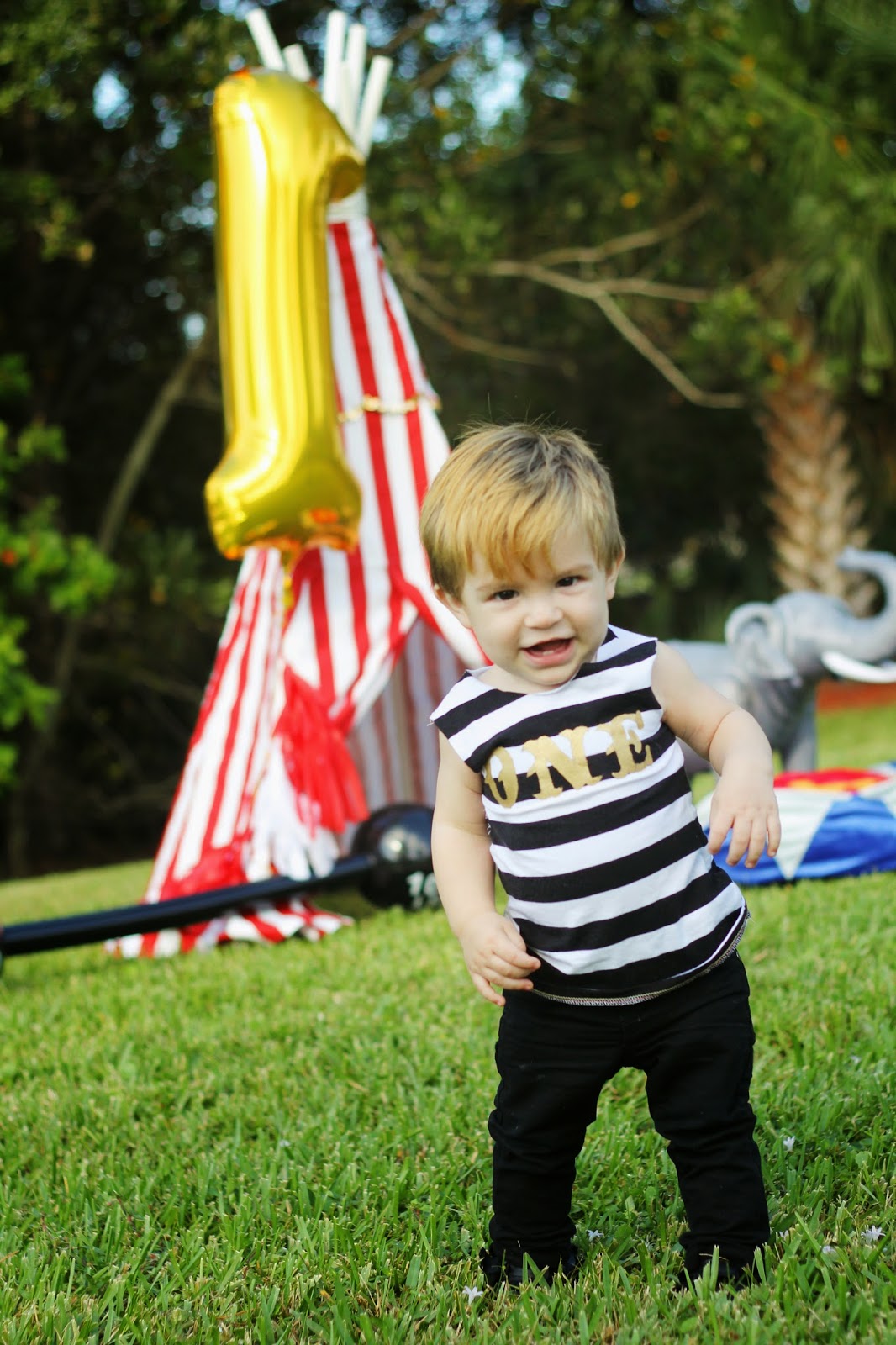 | First Birthday! He had so many first this year but his first has to be the biggest. He got a party in Florida with family and friends along with 2 cake smashes, a bouncy house and even a cotton candy machine! Sweets galore for his Cirque Du Jaxon theme party. |